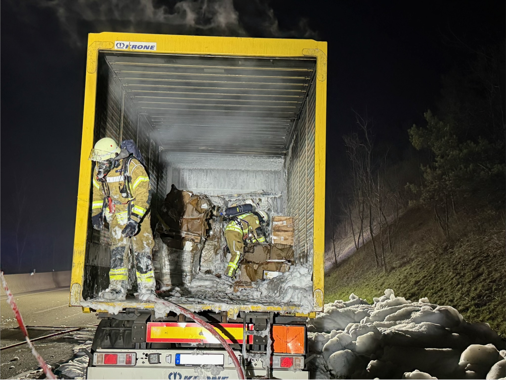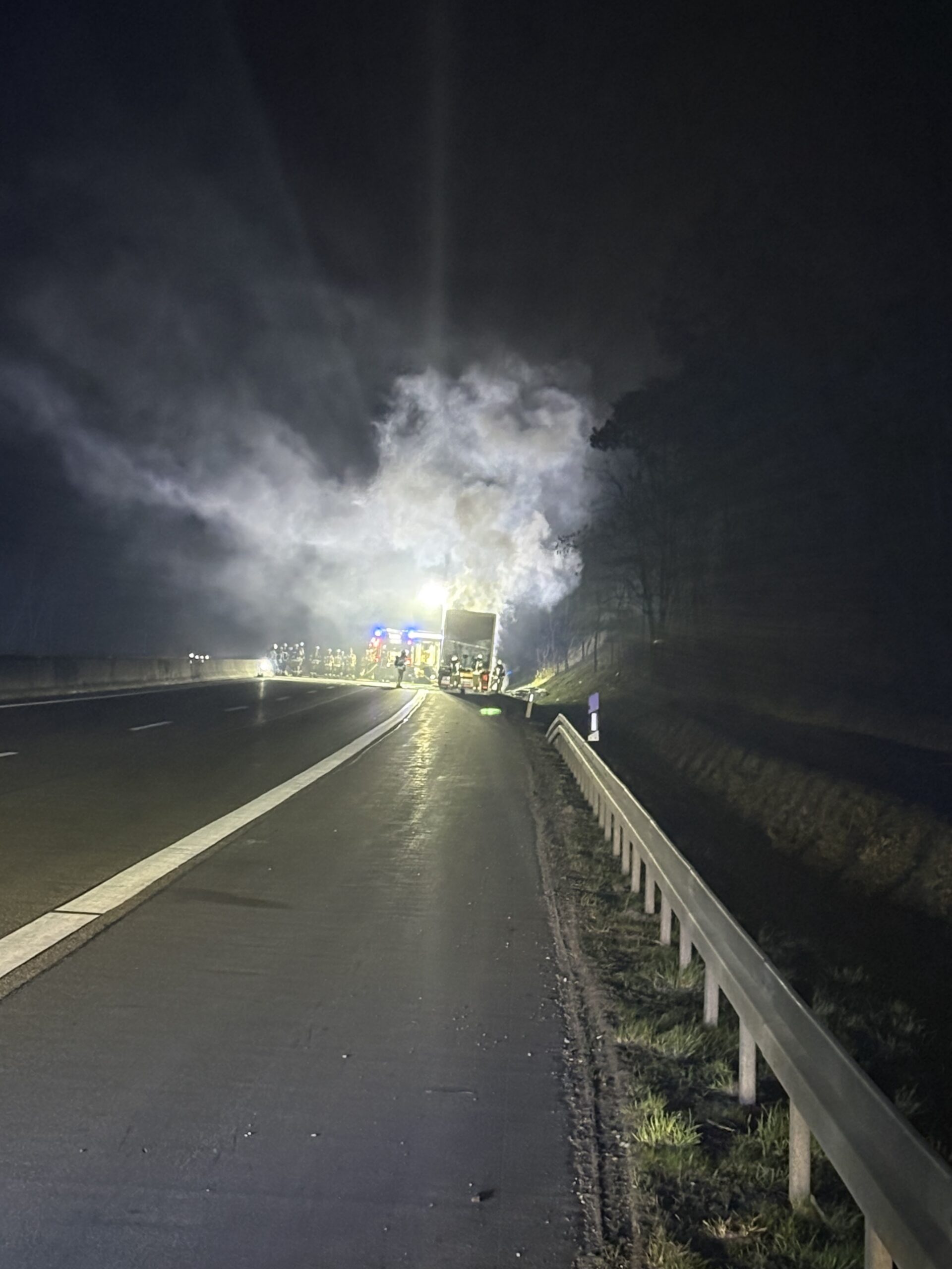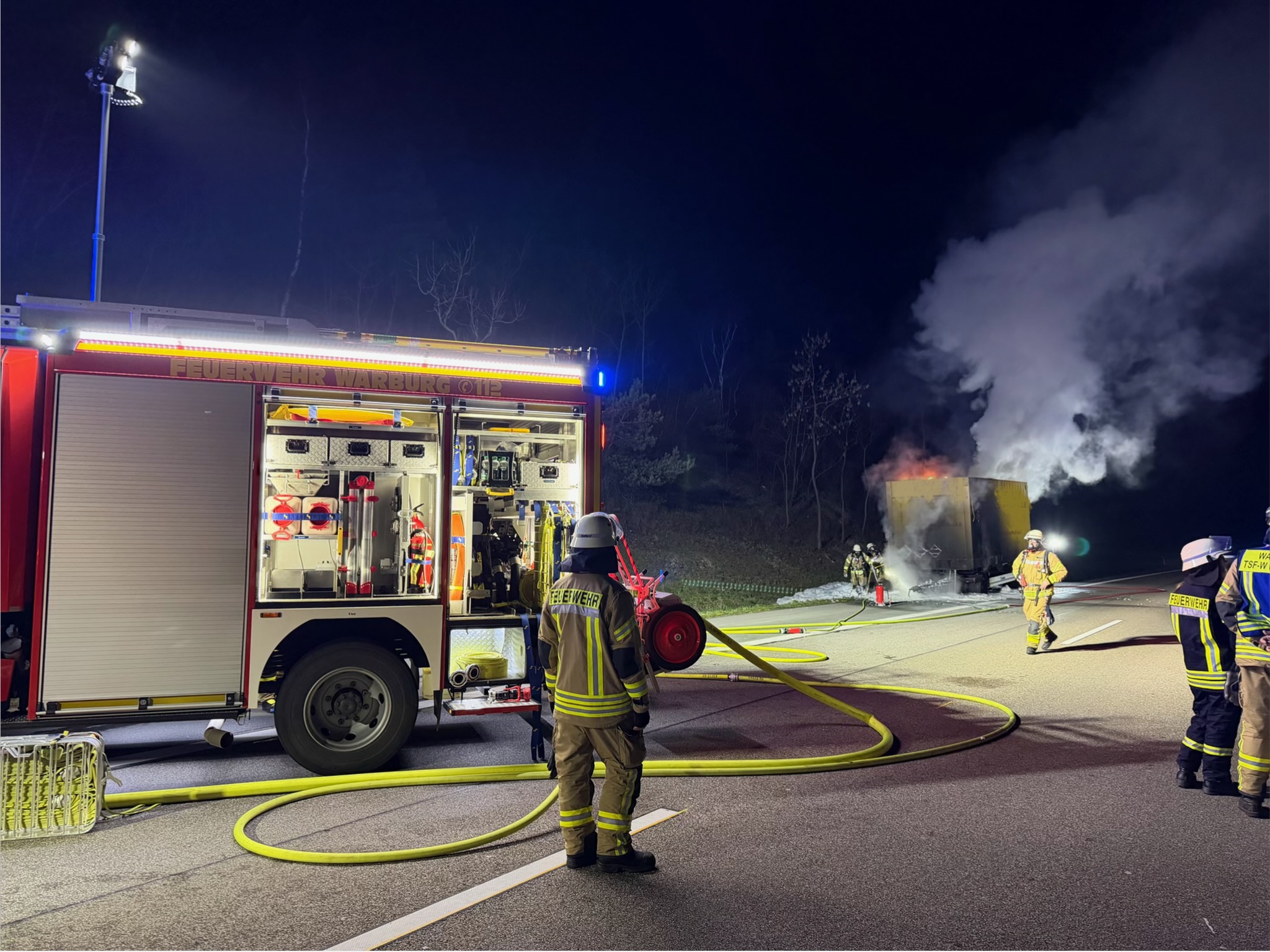 #60 am 10.03.2026, 02:19 Uhr, Bundesautobahn – A44 -> Kassel, Feuer, Brennt Gefahrgut-LKW, Bei Eintreffen stand ein mit Stückgut (mitunter mit Gefahrgut) beladener Anhänger in Flammen. Der Fahrer musste medizinisch versorgt werden, da er beim Versuch des Löschens Rauchgase eingeatmet hat. Da der Brand bereits von Außen in den Innenbereich des Anhängers gedrungen ist, mussten wir diesen entleeren um gezielt Ablöschen zu können. Die Erkundung hat ergeben, dass sich das Gefahrgut im LKW und nicht im Anhänger befunden hat. Die Autobahn musste während der Löscharbeiten vollgesperrt werden. | Bild 1 & Bild 2 & Bild 3 & Bild 4