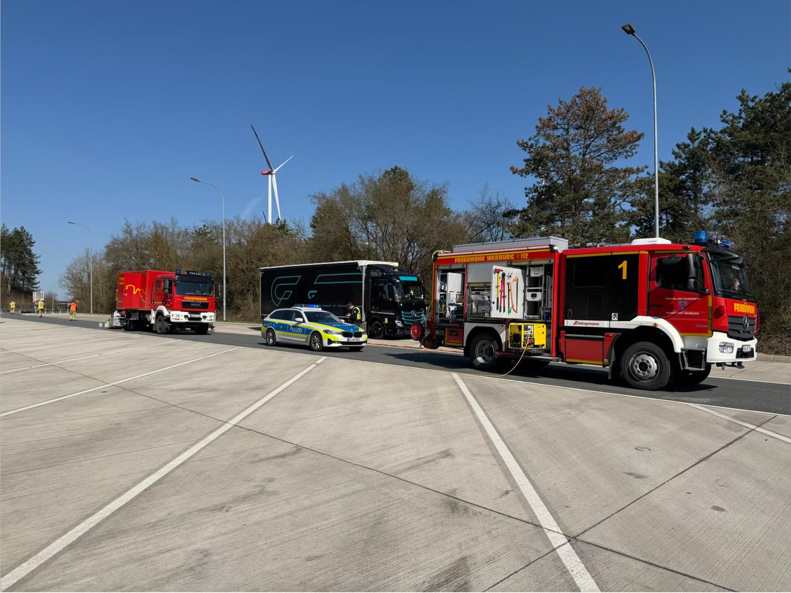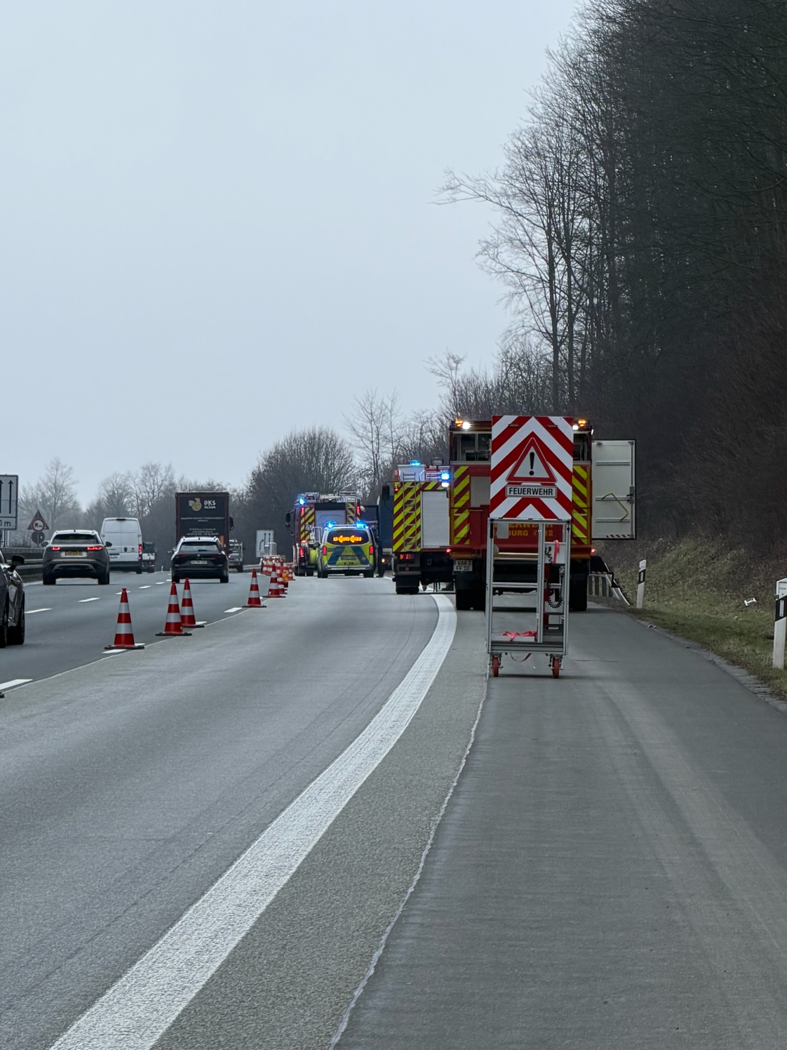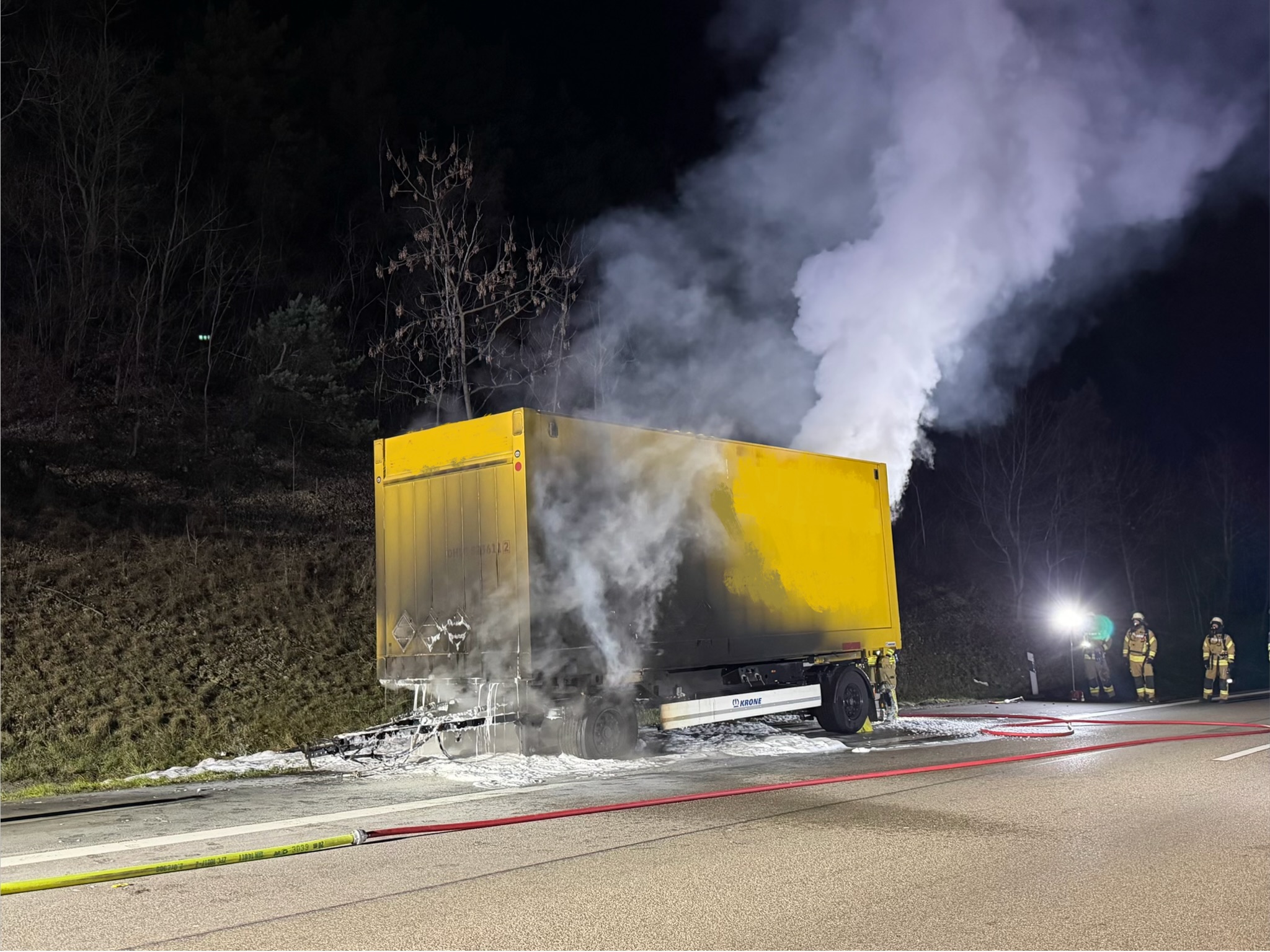 #60 am 10.03.2026, 02:19 Uhr, Bundesautobahn – A44 -> Kassel, Feuer, Brennt Gefahrgut-LKW, Bei Eintreffen stand ein mit Stückgut (mitunter mit Gefahrgut) beladener Anhänger in Flammen. Der Fahrer musste medizinisch versorgt werden, da er beim Versuch des Löschens Rauchgase eingeatmet hat. Da der Brand bereits von Außen in den Innenbereich des Anhängers gedrungen ist, mussten wir diesen entleeren um gezielt Ablöschen zu können. Die Erkundung hat ergeben, dass sich das Gefahrgut im LKW und nicht im Anhänger befunden hat. Die Autobahn musste während der Löscharbeiten vollgesperrt werden. | Bild 1 & Bild 2 & Bild 3 & Bild 4