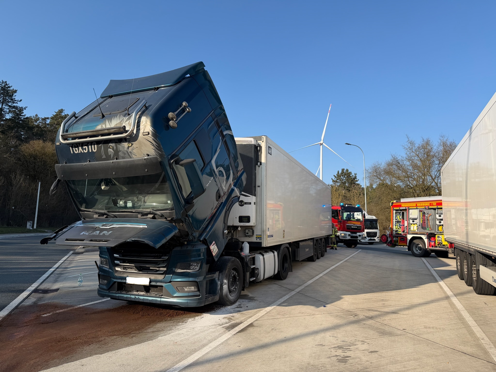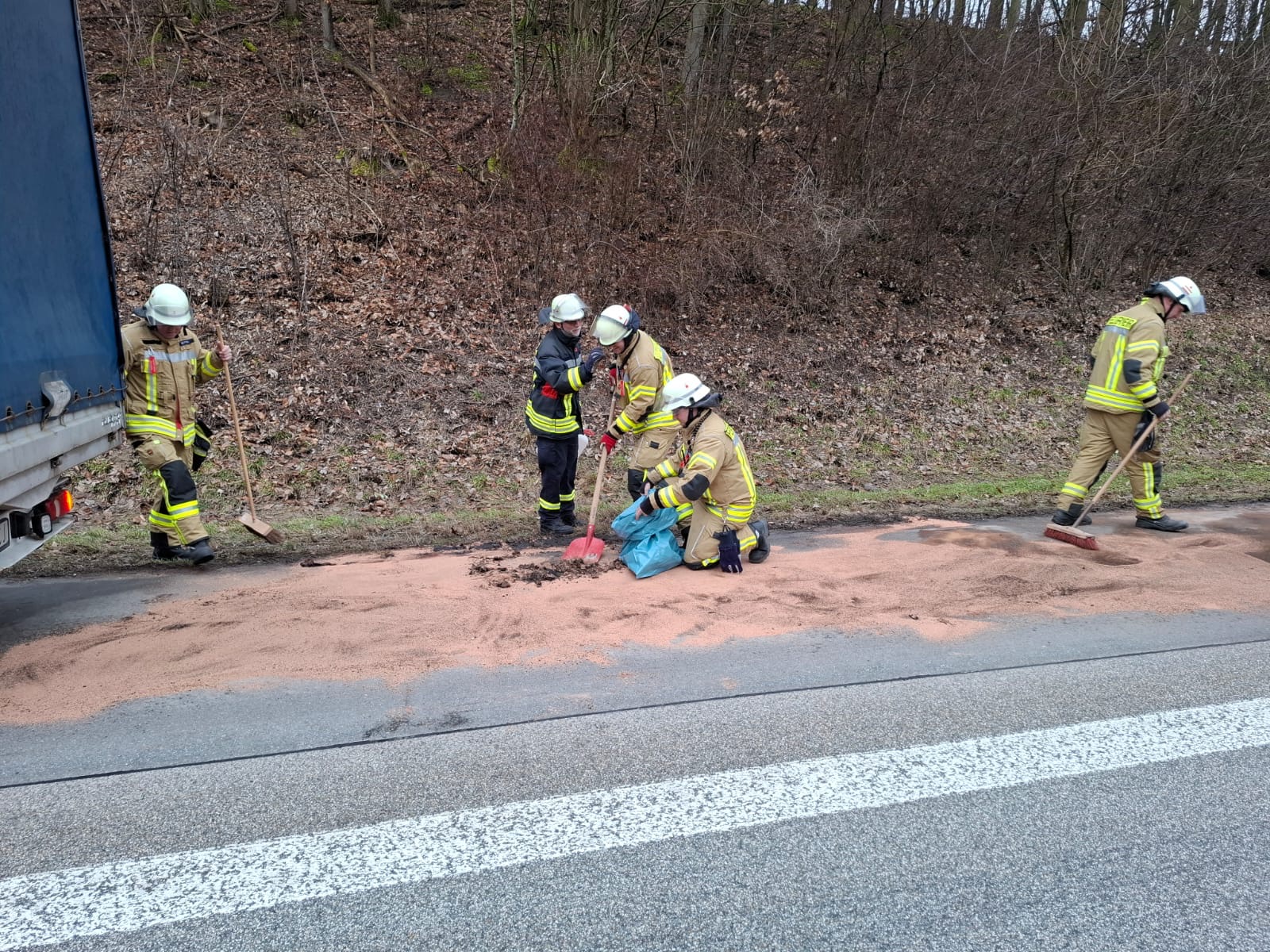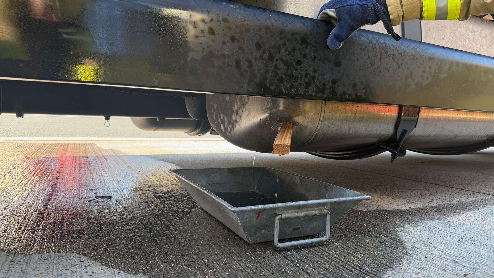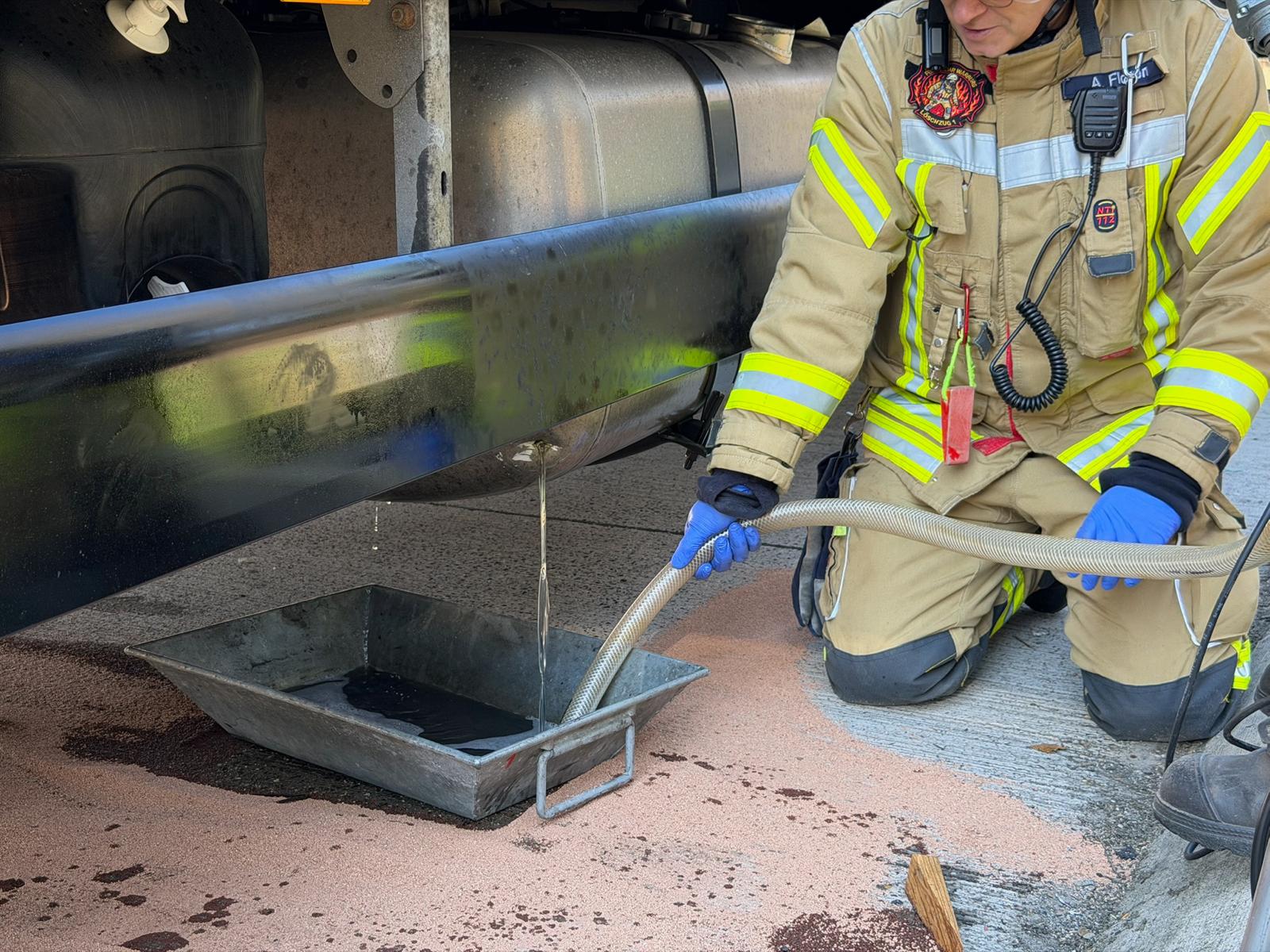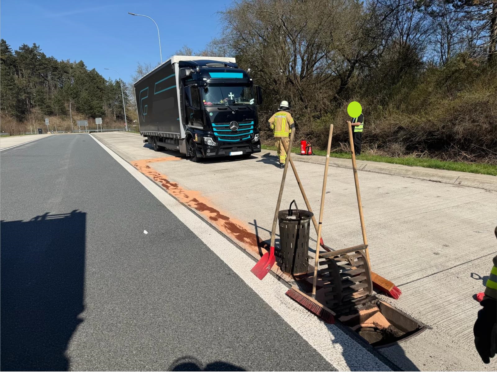 #70 am 18.03.2026, 11:32 Uhr, Bundesautobahn – A44 -> Kassel, Hilfeleistung, Leckgeschlagener Dieseltank an LKW, Ein LKW beschädigte seinen Dieseltank während der Fahrt. Wir nahmen den ausgelaufenen Diesel mit Bindemittel und Bioversal auf. Wir verschlossen das Leck mittels eines Holzkeils. Im Anschluss pumpten wir ca. 30 L Diesel ab und übergaben diesen den LKW Fahrer. Durch den Ölabscheider des Parkplatzes bestand keine weiterführende Gefahr durch den ausgelaufenen Diesel und Eintritt in die Kanalisation. | Bild 1 & Bild 2 & Bild 3 & Bild 4