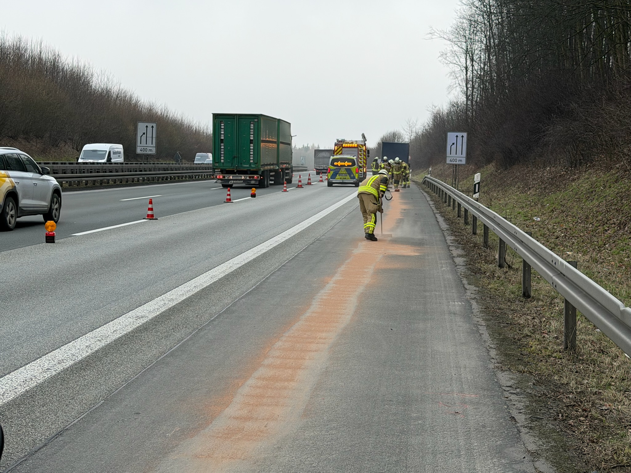 #44 am 25.02.2026, 09:07 Uhr, Bundesautobahn – A44 -> Dortmund, Hilfeleistung , PKW Brand , – Gemeldet war ein brennender PKW. Als wir an der Unfallstelle eingetroffen sind, handelte es sich um einen Kleintransporter, der einen Motorplatzer gehabt hatte und entsprechend eine Ölspur verursacht hat. Wir sicherten die Unfallstelle ab und nahmen das ausgelaufene Öl auf. | Bild 1 & Bild 2 & Bild 3 & Bild 4