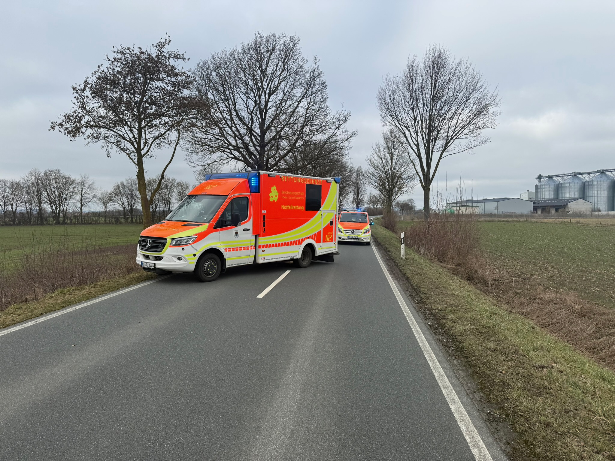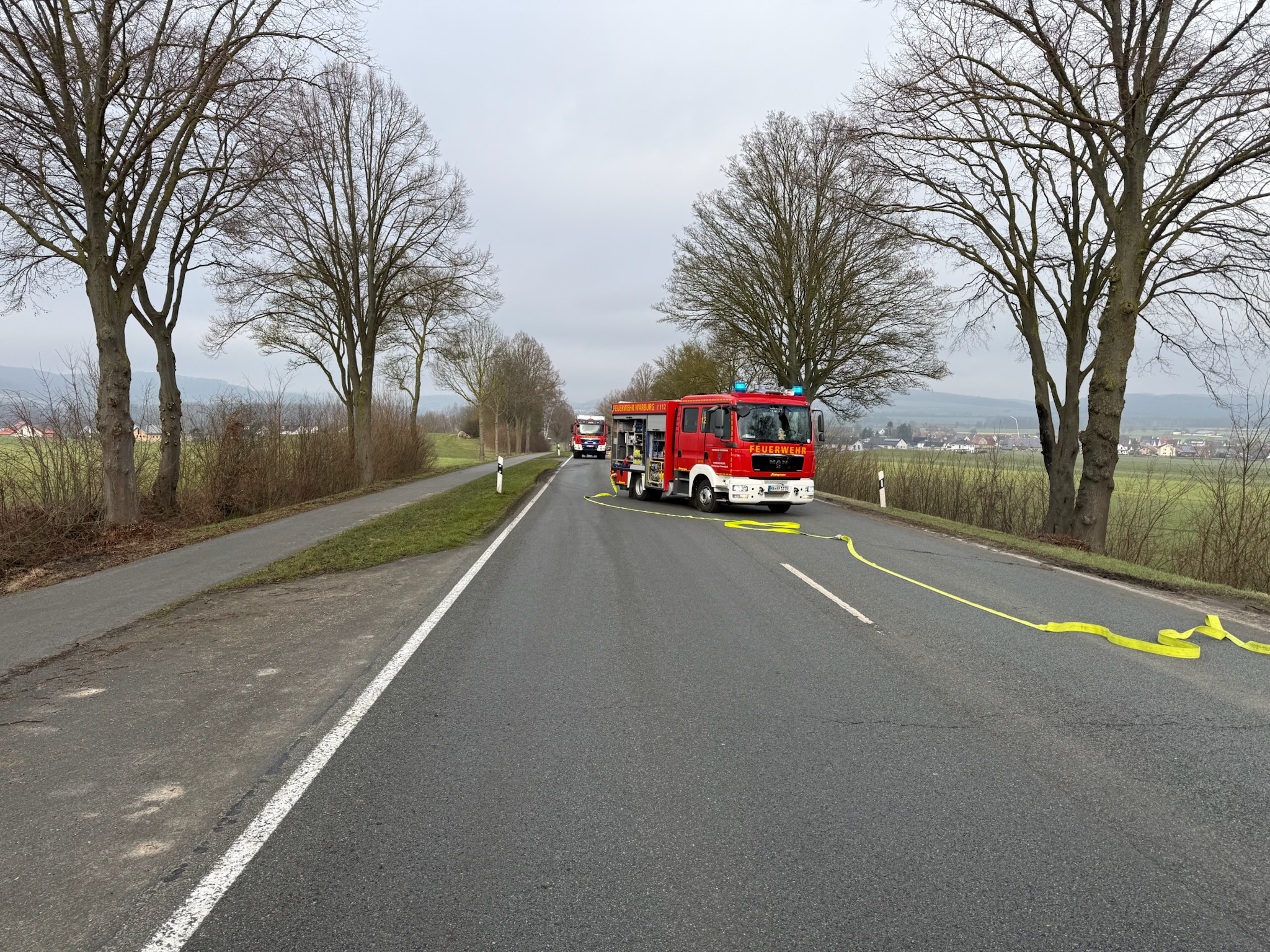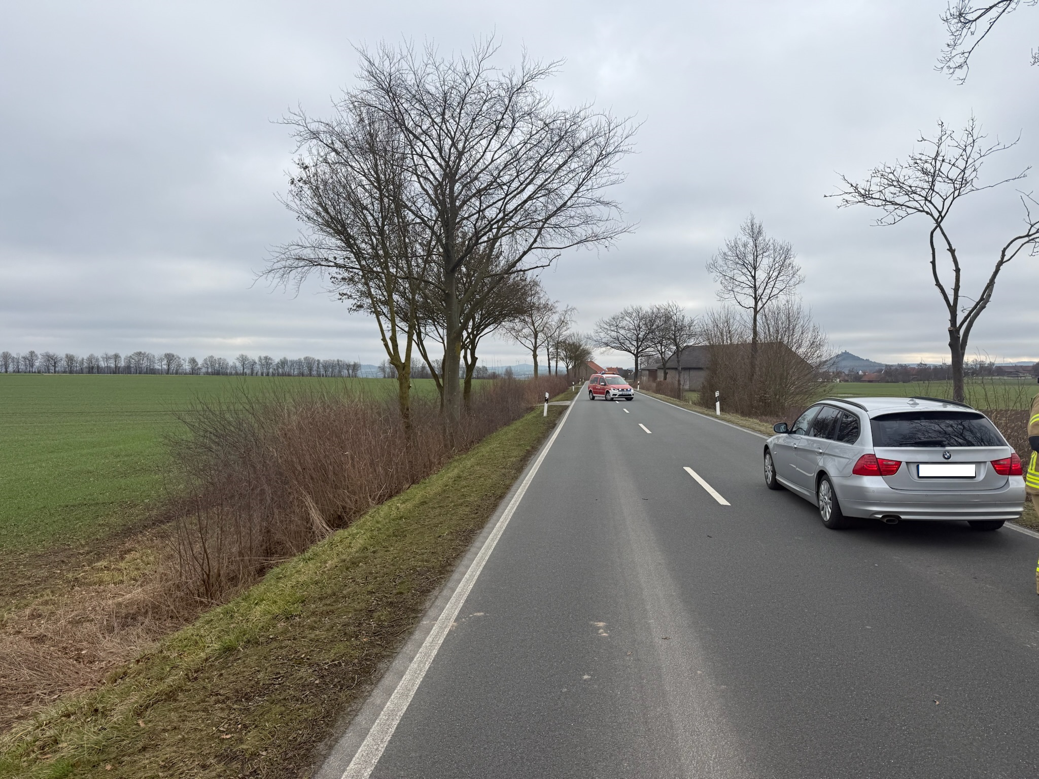 #45 am 25.02.2026, 11:00 Uhr, Dössel – K15 Dössel -> Hohenwepel, Hilfeleistung, PKW vor Baum, keine Person mehr im Fahrzeug, – Lage wie gemeldet. Wir sicherten die Unfallstelle ab, so dass der zeitgleich eingetroffene Rettungsdienst die medizinische Versorgung der verletzten Person übernehmen konnte. | Bild 1 & Bild 2 & Bild 3