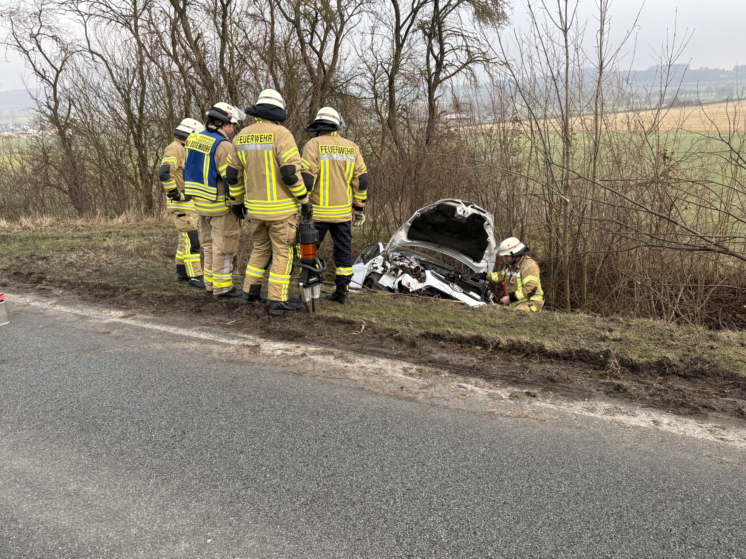 #50 am 27.02.2026, 09:14 Uhr, Ossendorf – B7 Ossendorf -> Warburg, Hilfeleistung, Alleinunfall PKW, Person noch im Auto, – Bei Eintreffen wurde die im Auto befindliche Person bereits durch den Rettungsdienst befreit. Wir sicherten die Unfallstelle ab, stellten den Brandschutz sicher und haben die Batterie abgeklemmt. | Bild 1 & Bild 2 & Bild 3 & Bild 4