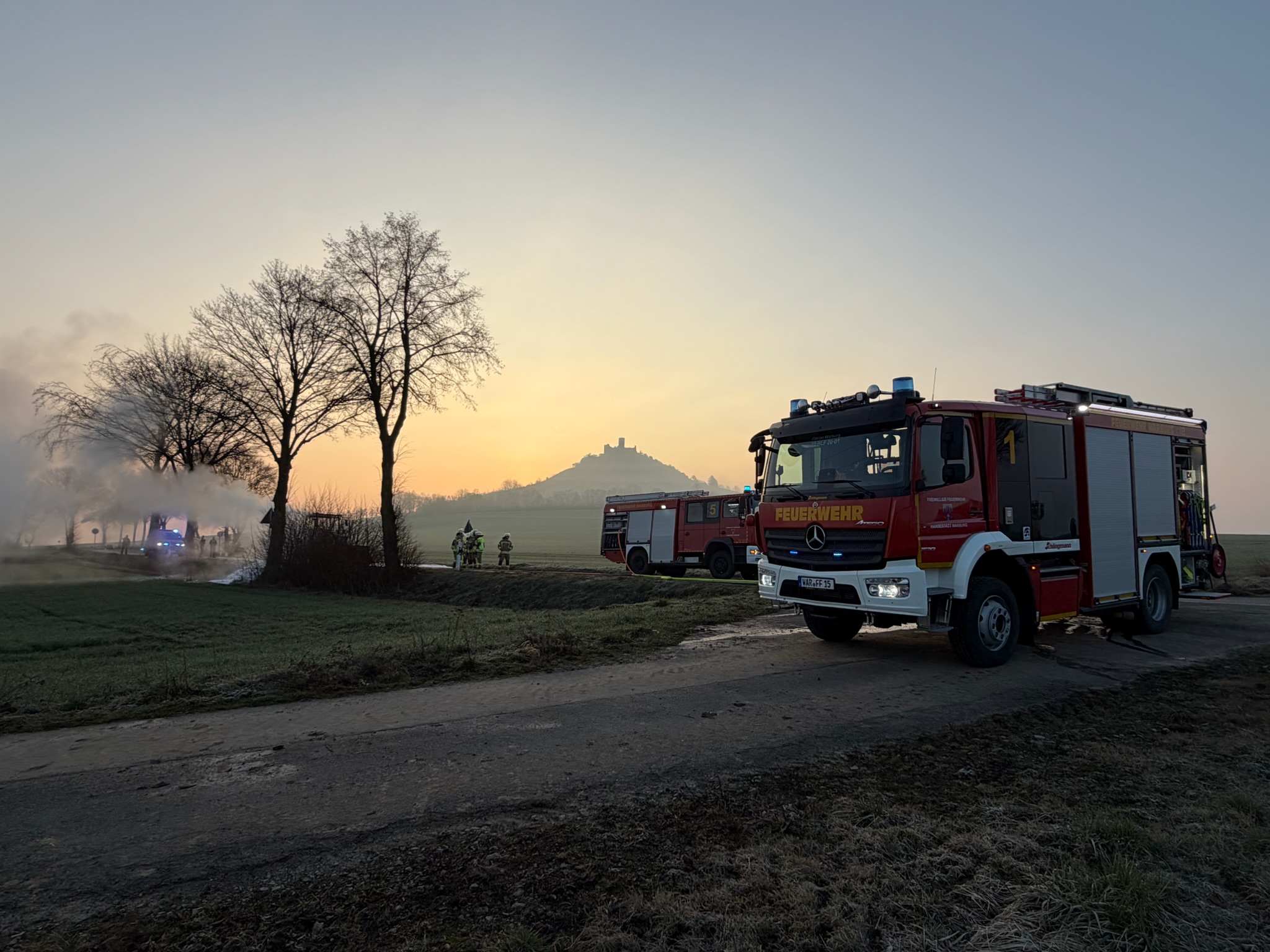 #36 am 13.02.2026, 04:30 Uhr, Warburg – In der Helle, Feuer, Gartenhüttenbrand, – Wir löschten eine brennende Gartenhütte. Nach Kontrolle mittels Wärmebildkamera entschieden wir uns dazu, die Brandreste noch mit einem Schaumteppich abzudecken um ein Wiederaufflammen zu verhindern. | Bild 1 & Bild 2 & Bild 3 & Bild 4