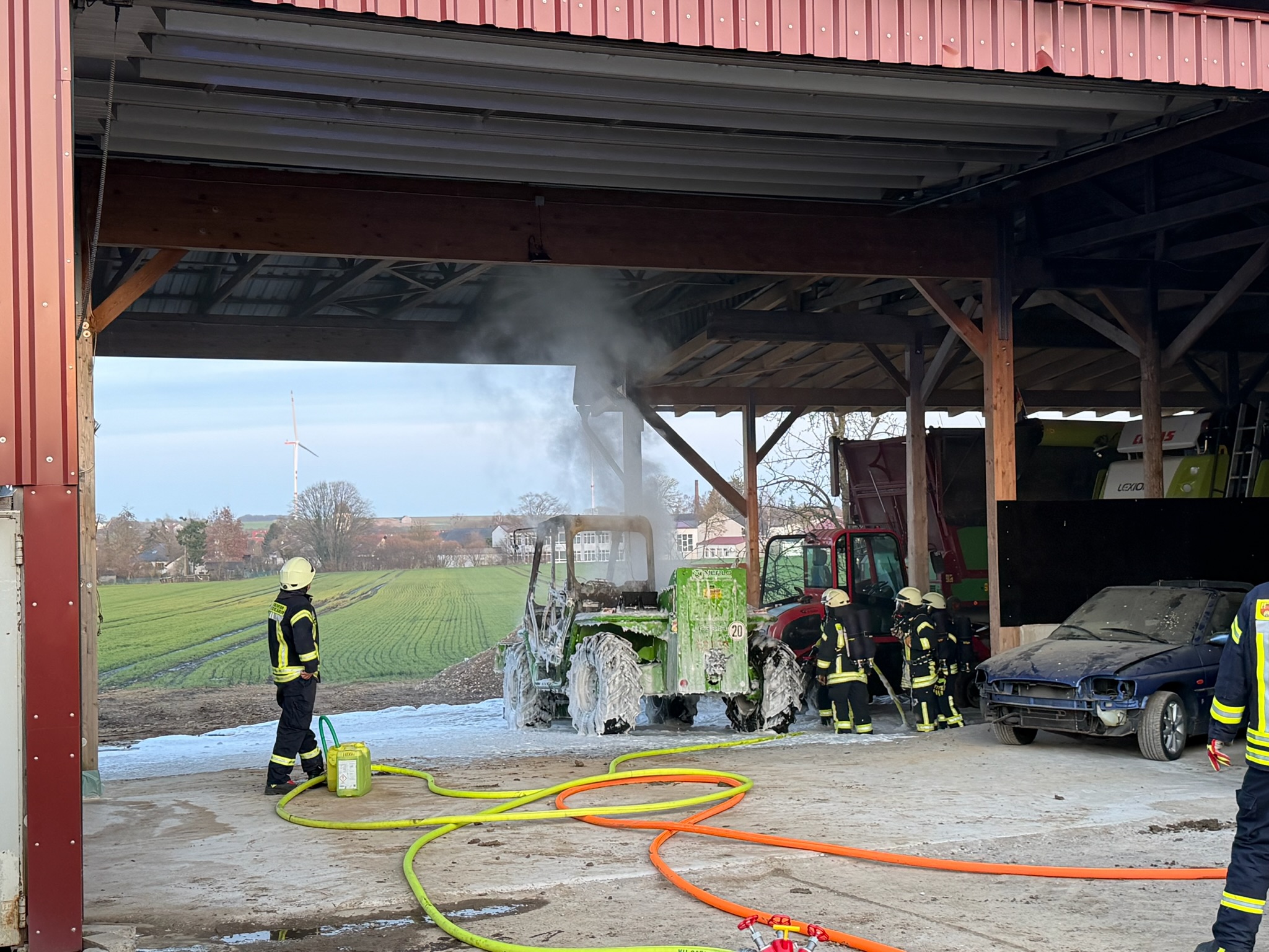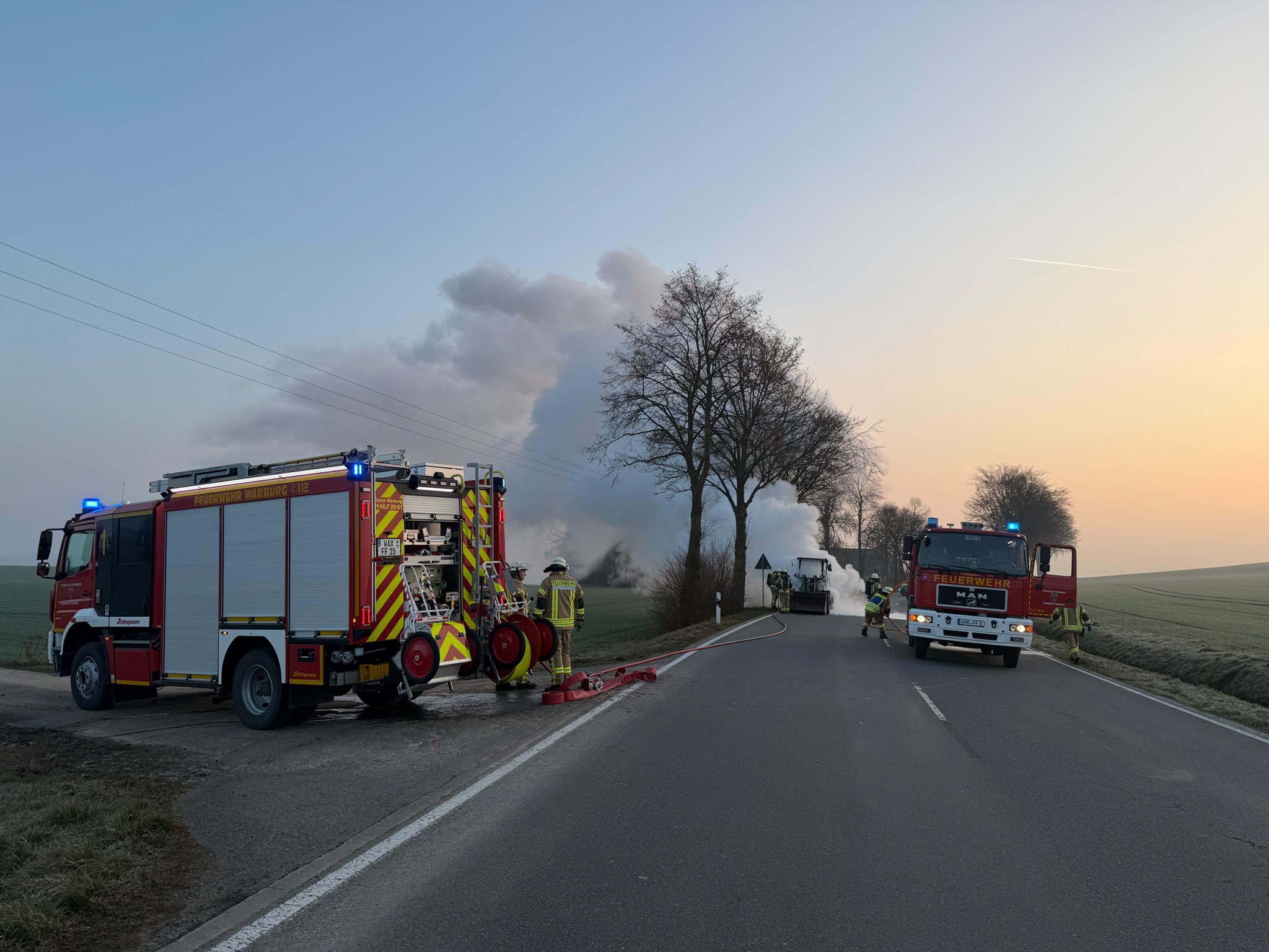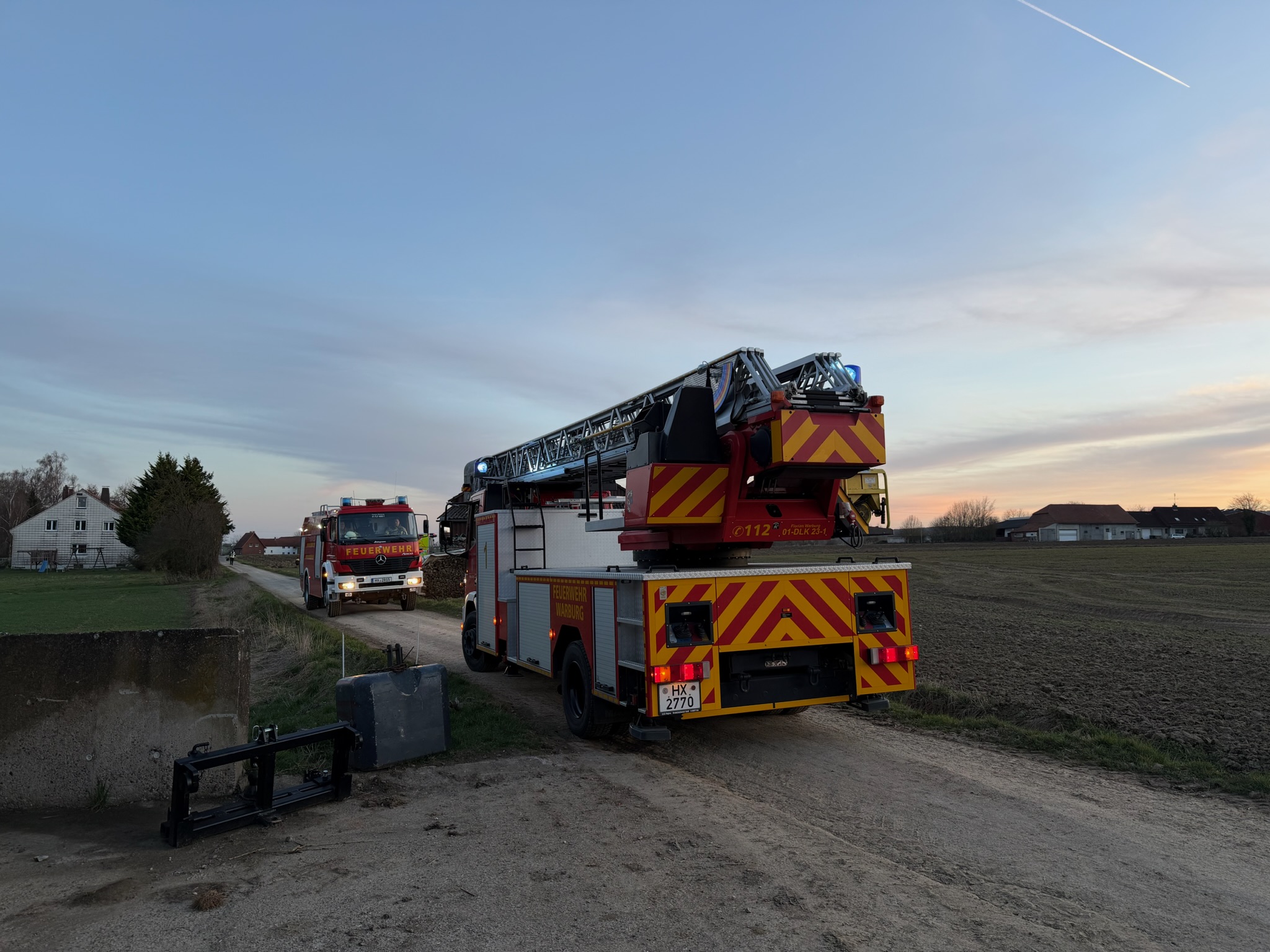 #65 am 12.03.2026, 17:55 Uhr, Peckelsheim – Grundweg, Feuer, Gebäudebrand, Wir fuhren als Unterstützung der FF Willebadessen mit Drehleiter und Tanklöschfahrzeug den Einsatzort an. Vor Ort stellte sich der Brand eines landwirtschaftlichen Geräts heraus. Durch uns waren keine Maßnahmen erforderlich, die FF Willebadessen löschte den Brand. | Bild 1 & Bild 2 & Bild 3